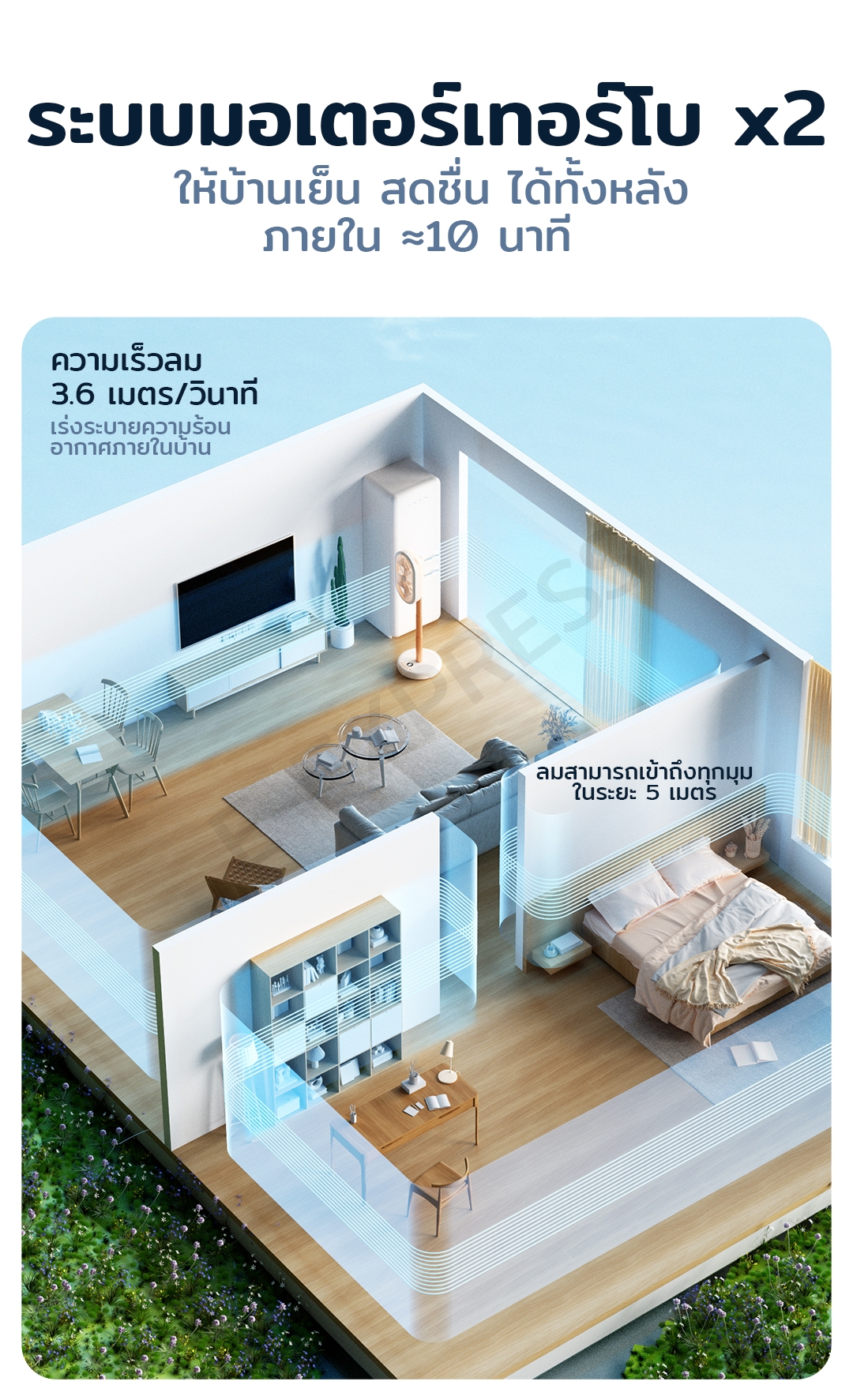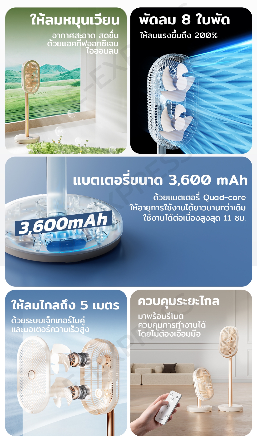 ✅ ให้ลมแรง 3.6 เมตร/วินาที ให้ลมได้ไกลถึง 5 เมตร